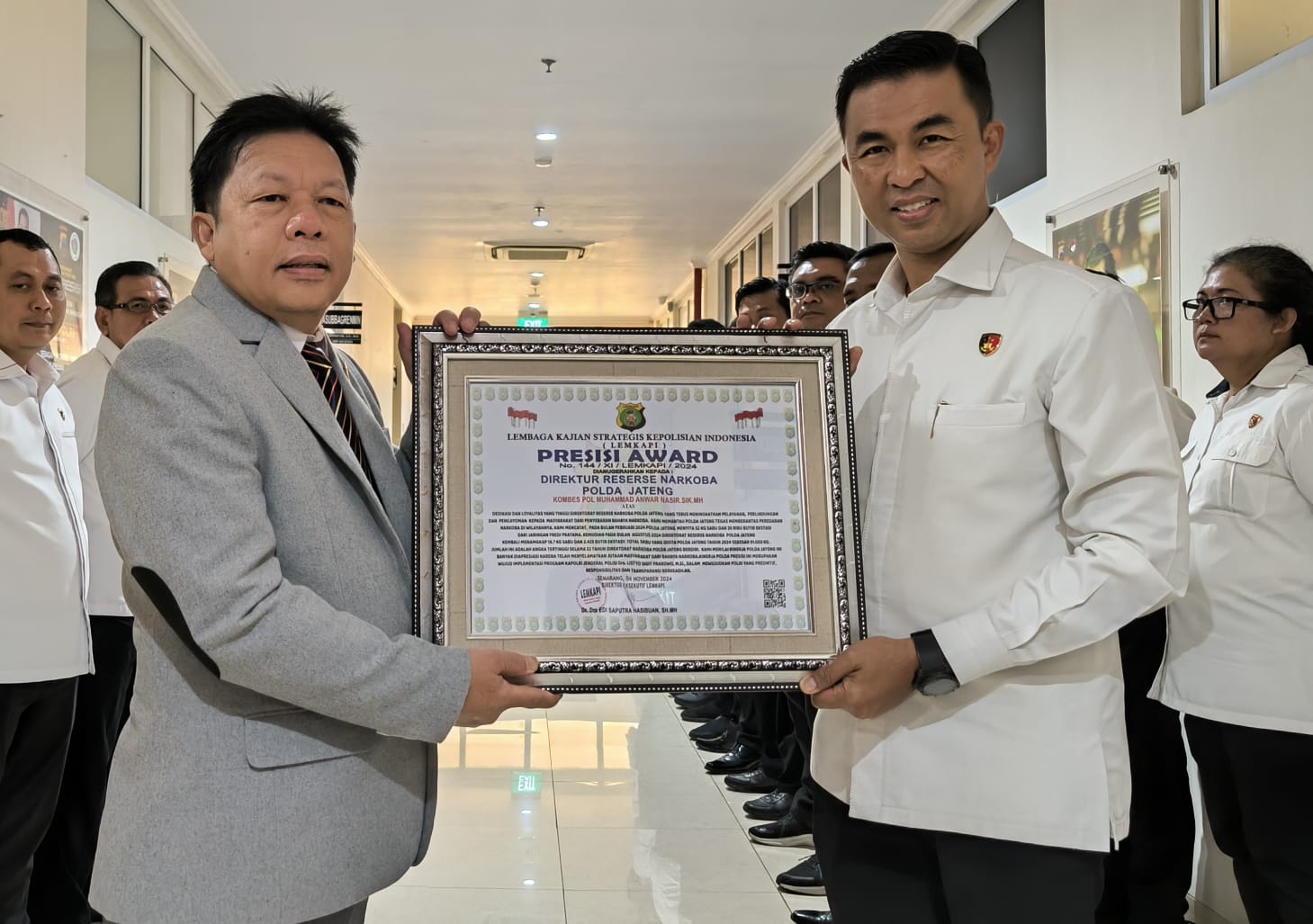 KOTA SEMARANG, sidikkriminal.co.id – Direktorat Reserse Narkoba Polda Jateng menerima penghargaan bergengsi, Presisi Award, yang diberikan langsung oleh Direktur Eksekutif Lembaga Kajian Strategis Kepolisian Indonesia (Lemkapi), Dr. Drs. Edi Saputra Hasibuan, S.H., M.H., kepada Kombes Pol Muhammad Anwar Nasir, S.I.K., M.H., selaku Direktur Reserse Narkoba Polda Jateng, pada Senin (04/11/2024) di Mapolda Jateng.