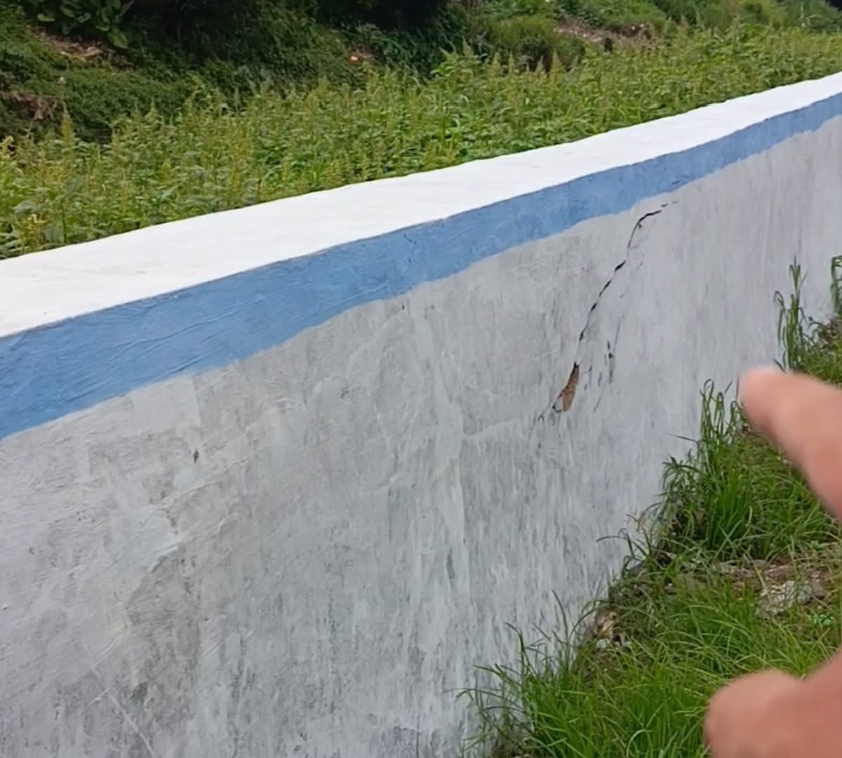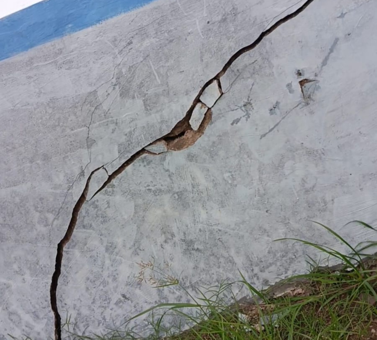 Lebih parah lagi, pada bagian dinding yang retak, adukan semen terlihat begitu lemah, bahkan bisa diremas dengan tangan.