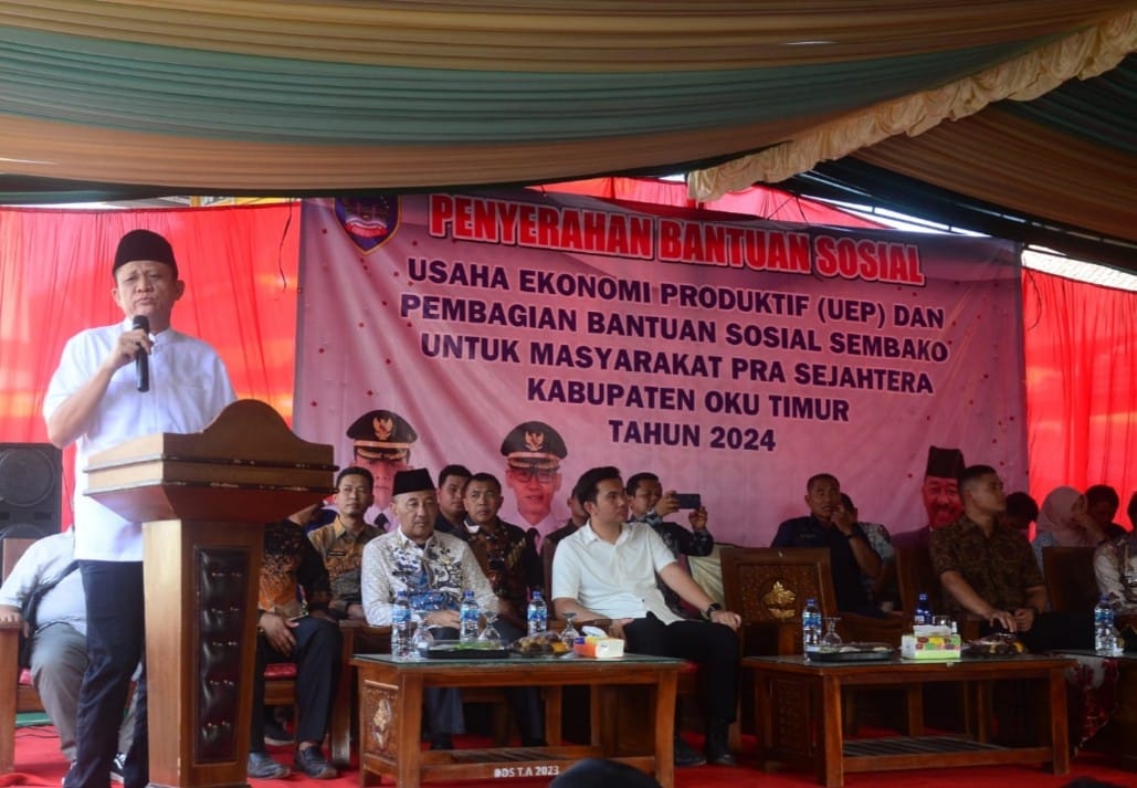OKU TIMUR, sidikkriminal.co.id – Bupati Ogan Komering Ulu (OKU) Timur Lanosin, S.T., M.T., menghadiri acara penyerahan bantuan Usaha Ekonomi Produktif (UEP) dan bantuan sosial sembako, bertempat di Gedung Sosat, Desa Cempaka, Kecamatan Cempaka, Jumat (26/07/2024).