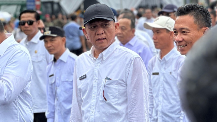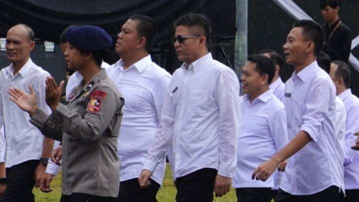 Mengenakan pakaian putih dan celana hitam, rintik hujan tidak menyurutkan semangat Enos-Yudha bersama kepala daerah terpilih lainnya untuk mengikuti gladi bersih ini, tampak wajah antusias keduanya tetap menyala.
