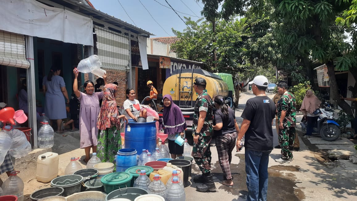 Di lokasi tempat peninjauan lokasi sumur bor dalam rangka TNI AD Manunggal Air, Komandan Kodim 0614 / Kota Cirebon berkesempatan ikut membagikan air bersih kepada warga RT.01 RW.05 / Kedung Krisik Utara dari PDAM Kota Cirebon bekerjasama dengan BPBD Kota Cirebon.