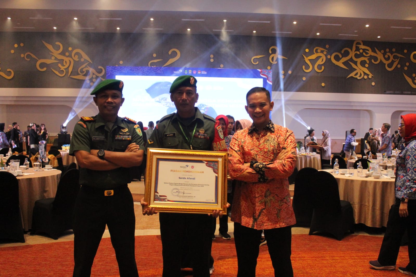 Di malam Anugrah Bangga Kencana dan penggalangan Komitmen Mitra tersebut, personil Kodim 0620/Kab Cirebon a/n Serda Afandi yang sehari hari menjadi Babinsa Tawangsari Koramil 0620- 04/Losari mendapatkan piagam Penghargaan Anugrah Bangga Kencana dan penggalangan Komitmen Mitra, Dandim 0620/Kab Cirebon Letkol Inf Aditya Wira Respati melalui Pasiter Kapten Chk. Suprinadi, S.H., bangga dengan prestasi yang diraih Serda Afandi.