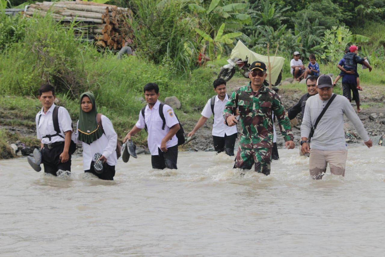 Selain survei jalan, rombongan juga meninjau gondola darurat yang saat ini menjadi satu-satunya alat penyeberangan bagi warga setempat. Di lokasi ini, Letkol Inf. Sapto Broto memberikan pengarahan terkait pentingnya keselamatan dalam penggunaan gondola.