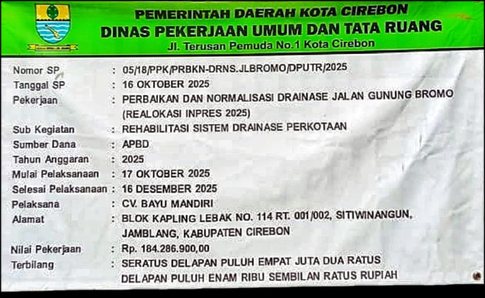 Adapun pelaksana kegiatan adalah CV Bayu Mandiri, beralamat di Blok Kapling Lebak No. 114 RT 001/002, Sitiwinangun, Jamblang, Kabupaten Cirebon.