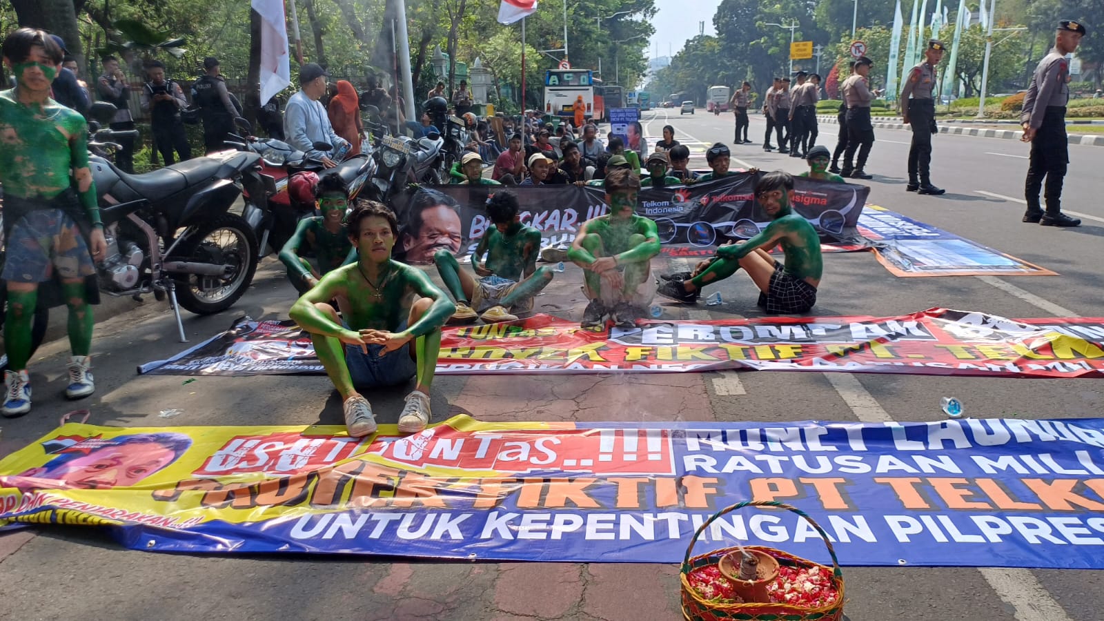 Bermula dari Bundaran Hotel Indonesia dengan aksi massa yang mengecat sekujur tubuh dengan warna hijau dan biru yang sempat di halang-halangi oleh aparat hingga akhirnya aksi massa melakukan long march hingga Patung Arjuna Wijaya, Jl. Medan Merdeka Barat. (02/09/2024).