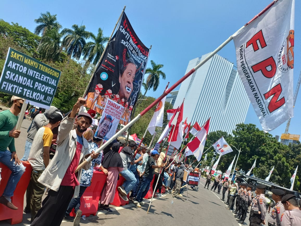 JAKARTA, sidikkriminal.co.id – Front Pergerakan Nasional (FPN) lakukan unjuk rasa di gedung KPK Merah Putih di Jl. HM. Soeharto, Kuningan Jakarta Selatan dan bergeser ke Jl. Medan Merdeka Barat, tepatnya di patung kuda Arjuna Wijaya pada hari Selasa (13/08/2024).
