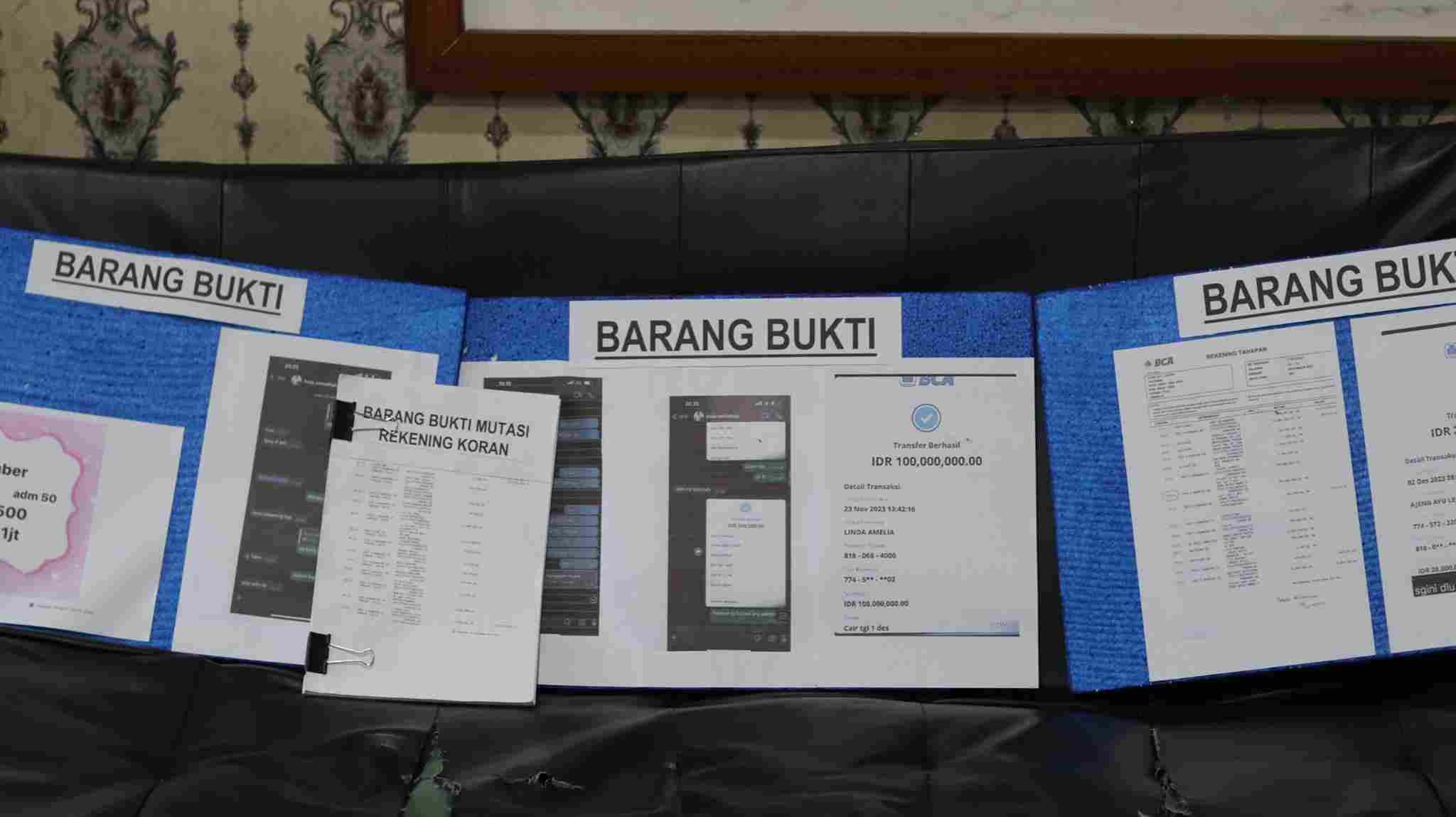Polisi juga menyita sejumlah barang bukti, di antaranya, Print out rekening koran yang menunjukkan transaksi Rp 100 juta ke rekening tersangka. Screenshot percakapan WhatsApp antara korban dan tersangka. Screenshot promosi skema titip dana di grup WhatsApp dan handphone yang digunakan tersangka untuk mengelola transaksi.