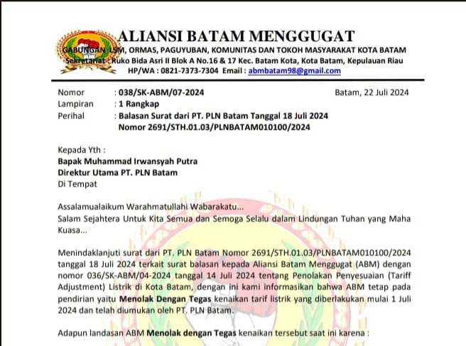 Surat dengan nomor 038/SK-ABM/07-2024 tertanggal 22 Juli 2024 tersebut terkait perihal balasan surat dari PT. PLN Batam tanggal 18 Juli 2024 nomor 2691/STH.01.03/PLNBATAM010100/2024.