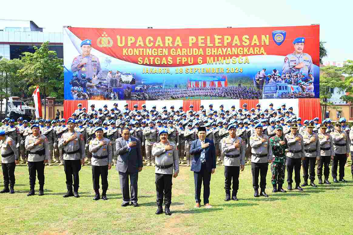 JAKARTA, sidikkriminal.co.id – Wakapolri Komjen Pol Agus Andrianto memimpin upacara pelepasan kontingen Garuda Bhayangkara Satuan Tugas Formed Police Unit (FPU) 6 MINUSCA dalam penugasan misi pemeliharaan perdamaian PBB ke negara Afrika Tengah. Upacara dilaksanakan di lapangan Bhayangkara Mabes Polri, Jakarta, Rabu (18/9/2024).