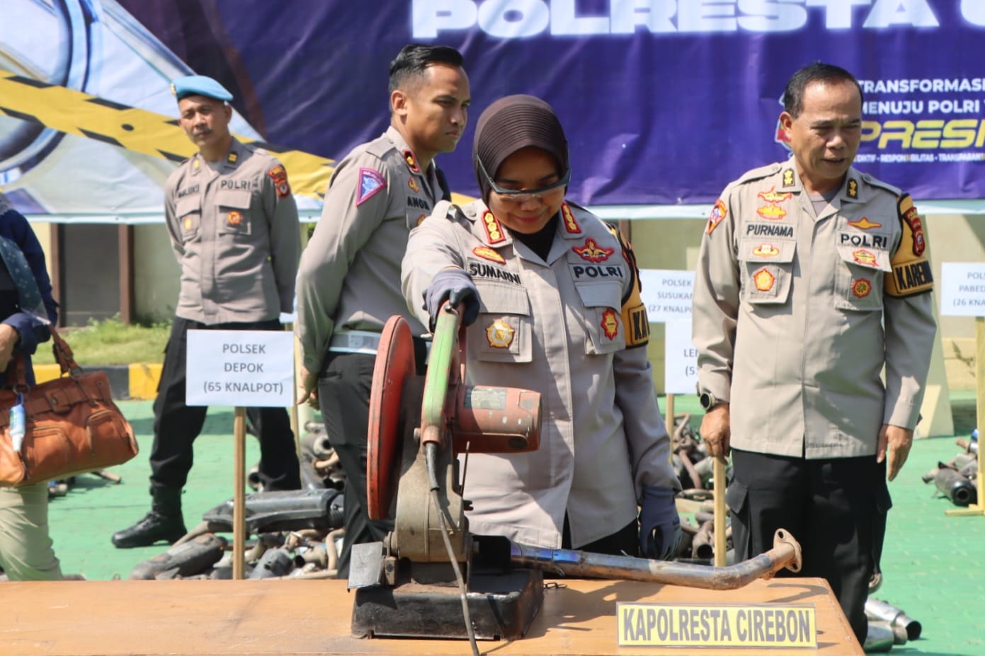 Pemusnahan ribuan knalpot tidak sesuai spesifikasi teknis ini dilakukan dengan cara memotong knalpot menggunakan mesin gerinda di halaman upacara Mapolresta Cirebon Jl. Dewi Sartika, Kecamatan Sumber, Kabupaten Cirebon. Pemusnahan dilakukan langsung oleh Kapolresta Cirebon Kombes Pol Sumarni, S.I.K., S.H., M.H., Penjabat (Pj) Bupati Cirebon Drs. H. Wahyu Mijaya, S.H., M.Si., dan Pejabat Utama Polresta Cirebon serta Forkompinda Kabupaten Cirebon lainnya.