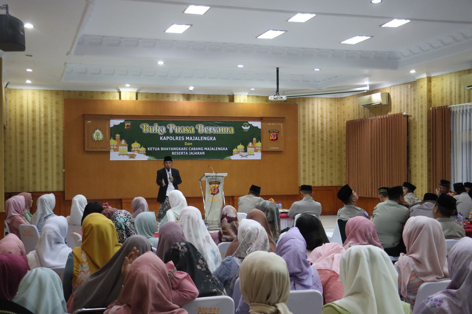 Kapolres Majalengka AKBP Indra Novianto melalui Wakapolres dalam sambutannya, menyampaikan kegiatan buka puasa bersama ini adalah untuk menjalin silaturahmi tali cinta kasih dan peduli sesama antar umat beragama serta untuk meningkatkan ketaqwaan, sinergitas dengan Semangat melayani di bulan suci Ramadhan 1446 H.