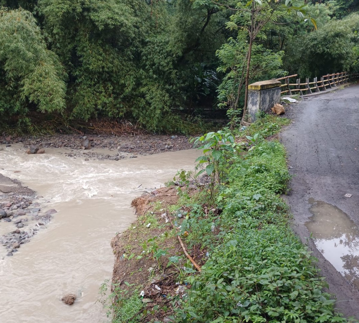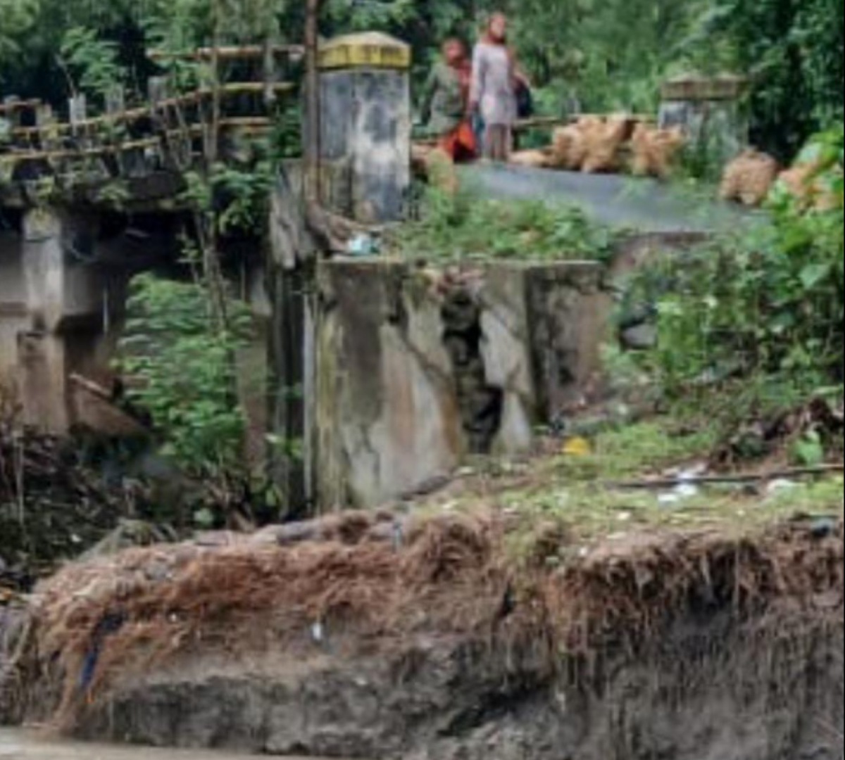 Bagian penopang jembatan mengalami kerusakan signifikan akibat derasnya arus banjir yang meluap, sehingga berpotensi membahayakan keselamatan warga yang melintas.