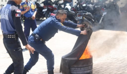Dalam latihan dan simulasi itu, personel pemadam kebakaran terlihat memperlihatkan cara pemadaman api ringan, teknik memadamkan api menggunakan karung yang telah dibasahi air.