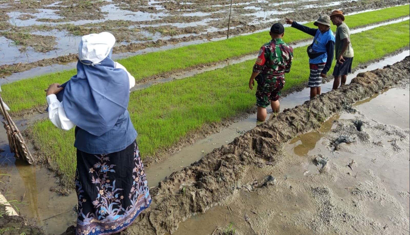 Babinsa Kelurahan Larangan, Serka Agus Setiawan, turut serta memantau perkembangan bibit padi di lokasi, sekaligus memberikan arahan terkait perawatan yang harus dilakukan oleh para petani. pada Kamis, (13/02/2025).