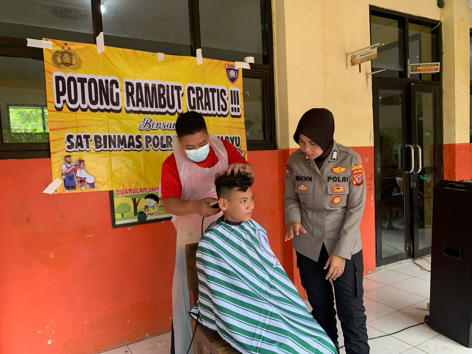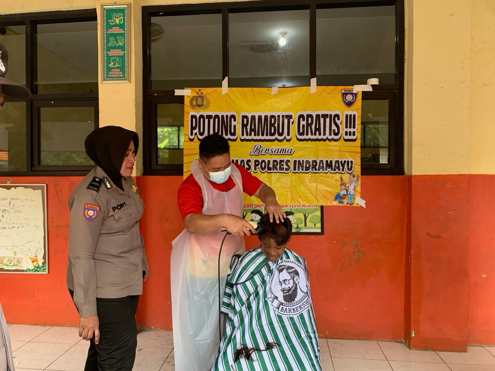 Polisi Hadirkan Cukur Rambut Gratis Untuk Pelajar SD di Indramayu