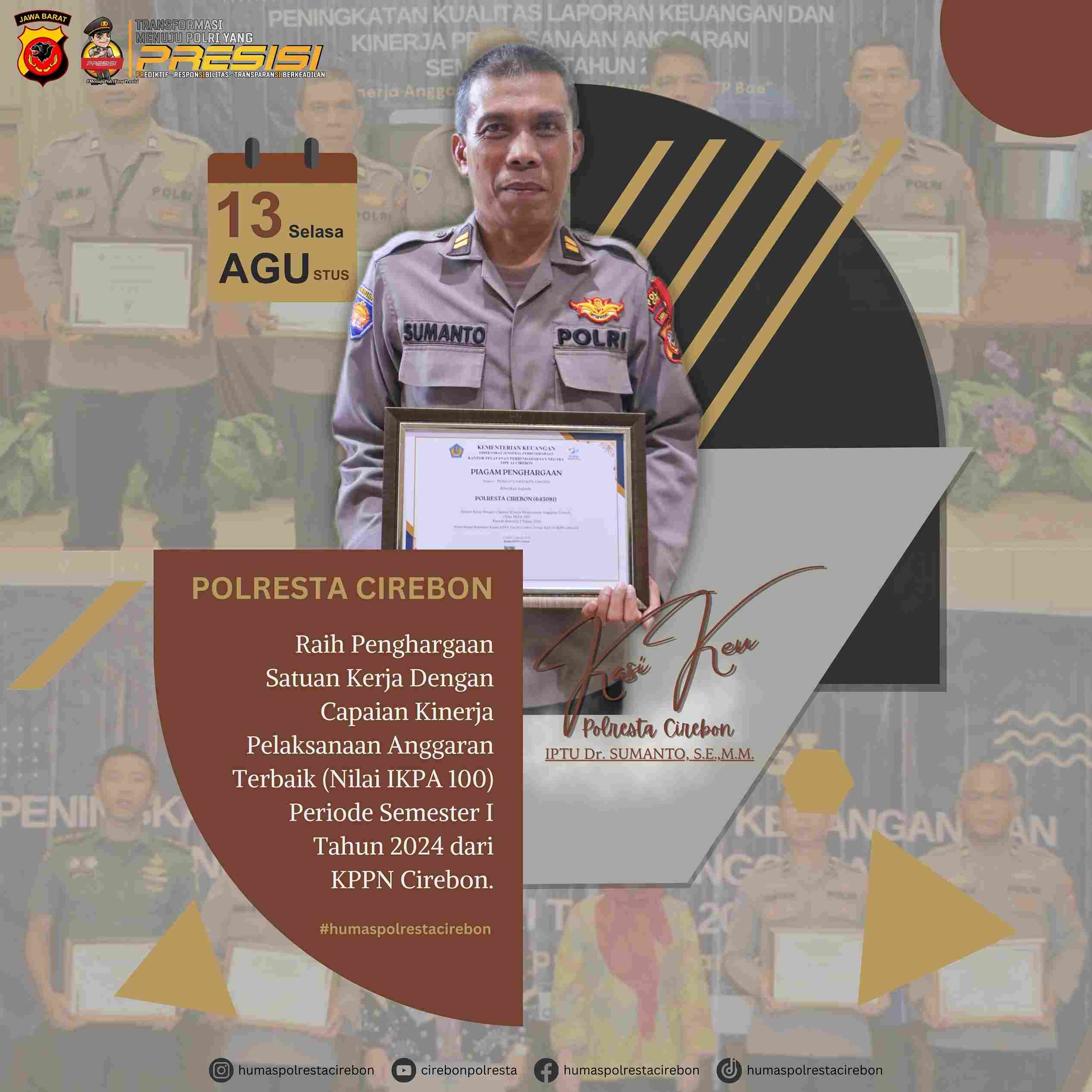 “Penghargaan ini merupakan hasil kerja keras seluruh jajaran Polresta Cirebon yang mencatatkan prestasi gemilang dalam pengelolaan keuangan dan kinerja pelaksanaan anggaran. Penghargaan ini juga menjadi motivasi bagi kami untuk terus meningkatkan kinerja dan memberikan pelayanan terbaik kepada masyarakat,” ujarnya, Senin (26/8/2024).