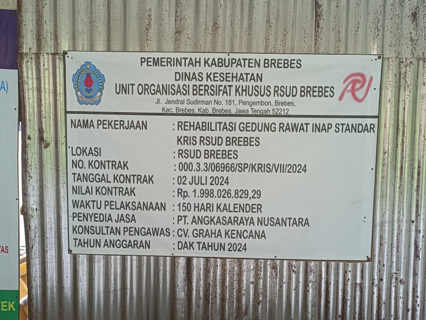 BREBES, sidikkriminal.co.id – Proyek rehabilitasi gedung rawat inap yang ada di RSUD Brebes menuai polemik. Pasalnya, proyek yang dianggarkan oleh pemerintah dengan sumber anggaran DAK 2024 itu molor dari jadwal yang tercantum dalam kontrak kerja.