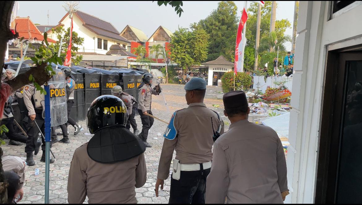 Kapolres Cirebon Kota AKBP M. Rano Hadiyanto terlihat turun langsung dan berusaha menenangkan aksi massa yang mulai tidak terkendali.
