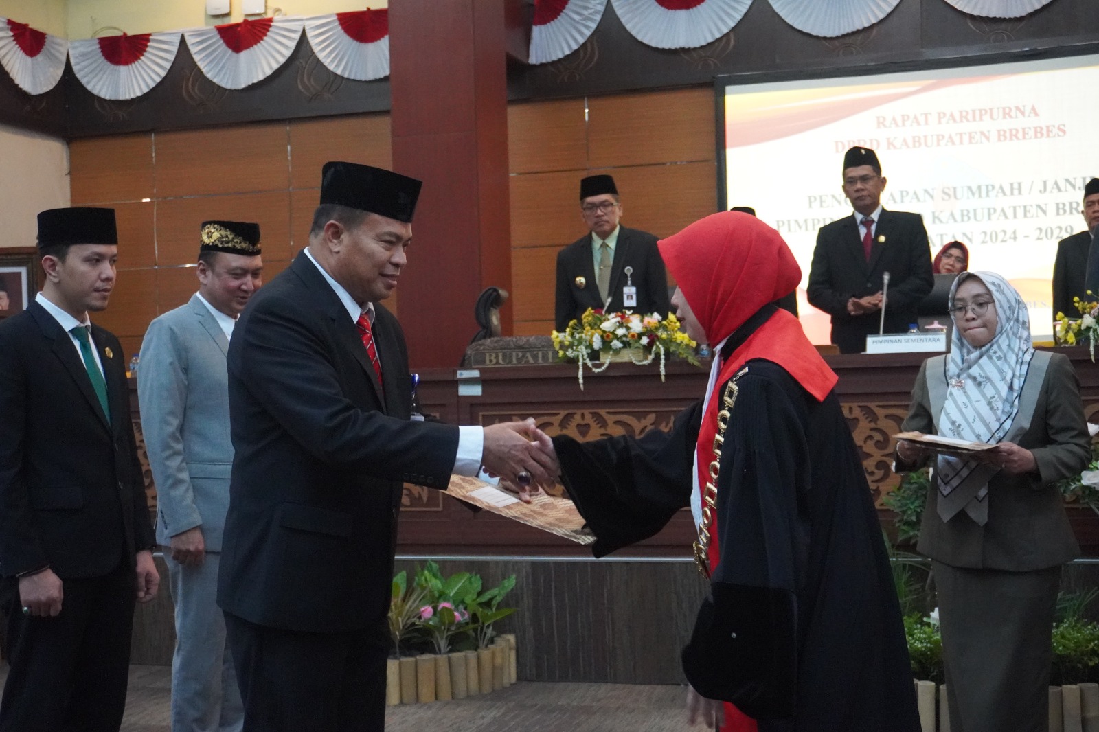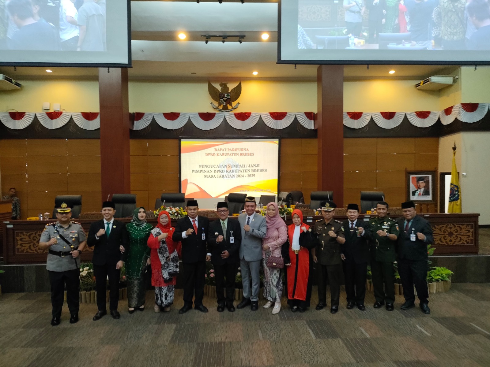 Pelantikan Pimpinan DPRD Kabupaten Brebes tersebut, digelar melalui rapat paripurna Senin (21/10/2024) siang di Lt.2 Gedung DPRD Brebes. Prosesi pelantikan disaksikan langsung Penjabat (Pj) Bupati Brebes Ir. Djoko Gunawan, M.T., jajaran Forkopimda Brebes, para anggota DPRD Brebes, Pj Sekretaris Daerah Brebes, Kepala Organisasi Perangkat Daerah (OPD) di jajaran Pemkab Brebes serta tamu undangan lainnya.
