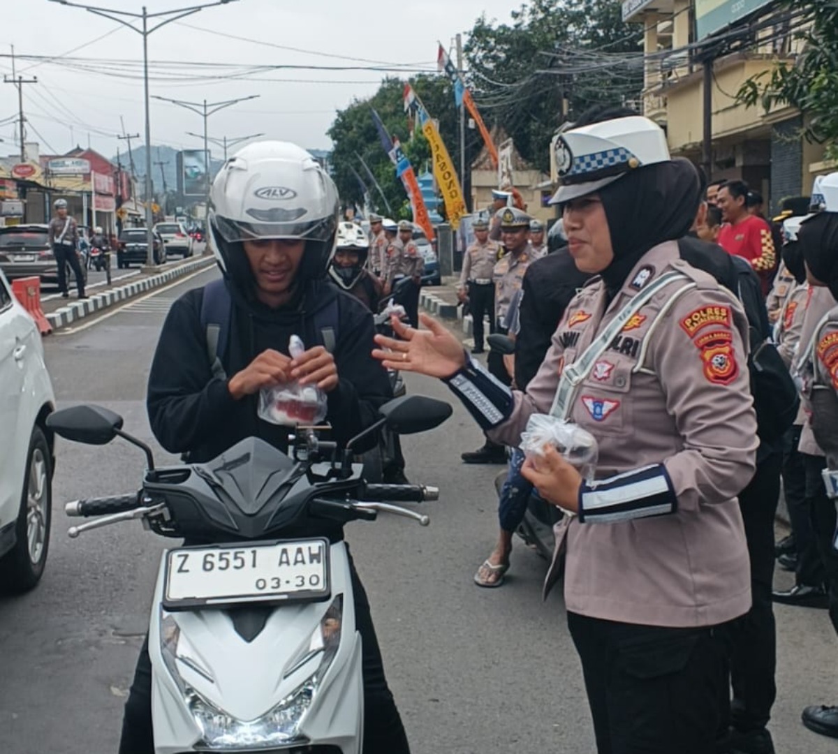 Anggota Satlantas tampak membagikan paket takjil secara langsung dengan penuh kehangatan dan humanis.