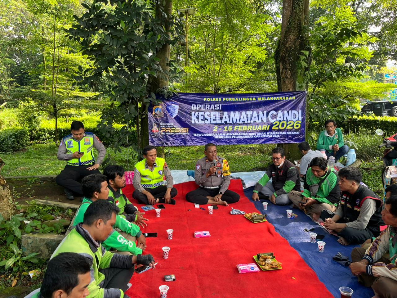 Satuan Lalu Lintas (Satlantas) Polres Purbalingga menggelar kegiatan Juguran dan Ngopi Bareng Ojol (ojek online) di pangkalan Selabaya, Kecamatan Kalimanah, Kabupaten Purbalingga, Kamis (5/2/2026). Acara ini dilaksanakan dalam rangka Operasi Keselamatan Candi 2026.