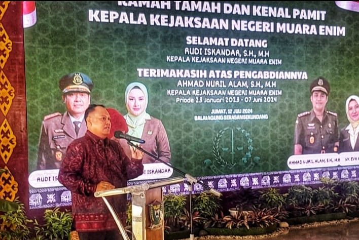 MUARA ENIM, sidikkriminal.co.id – Sekretaris Daerah Kabupaten (Sekdakab) Muara Enim, Ir. Yulius, M.Si., menghadiri acar pisah sambut Kepala Kejaksaan Negeri Muara Enim dari Ahmad Nuril Alam, S.H., M.H., kepada Rudi Iskandar, S.H., M.H., yang digelar di Balai Agung Serasan Sekundang (BASS), Jumat (12/07/2024).