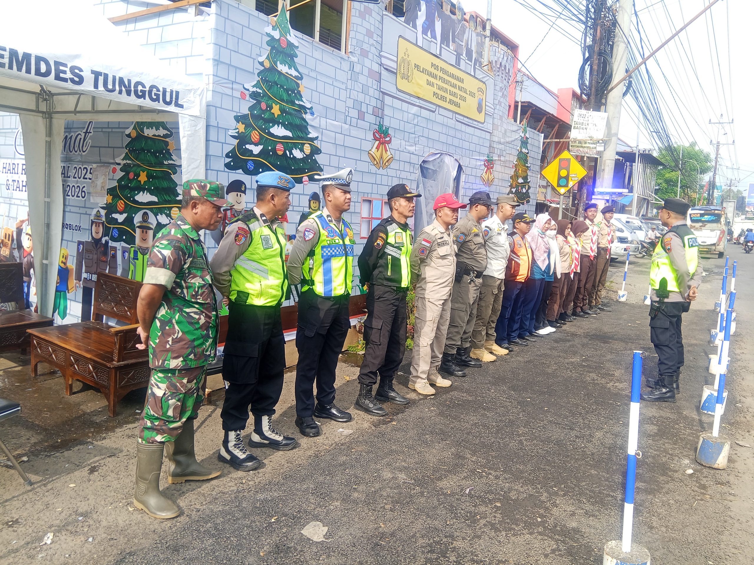 JEPARA, sidikkriminal.co.id – 25-12-2025 – Dalam rangka mendukung kelancaran perayaan Natal dan Tahun Baru (NATARU) Tahun 2025, anggota Koramil 03/Batealit melaksanakan kegiatan Pos Pengamanan (Pos Pam) di depan Pasar Mayong, Kabupaten Jepara.