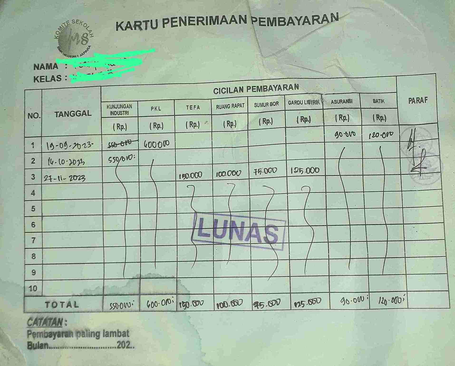 “Dana tersebut sudah dibahas dengan komite dan disepakati bersama orang tua murid,” ujar Pak Jaelani. Sebagai contoh, Gardu Listrik yang telah dibeli dari PLN Kuningan seharga Rp 130 juta, sebagian dananya berasal dari subsidi silang siswa. Namun, ia tidak dapat memberikan rincian total anggaran untuk keperluan lain yang belum terealisasi.