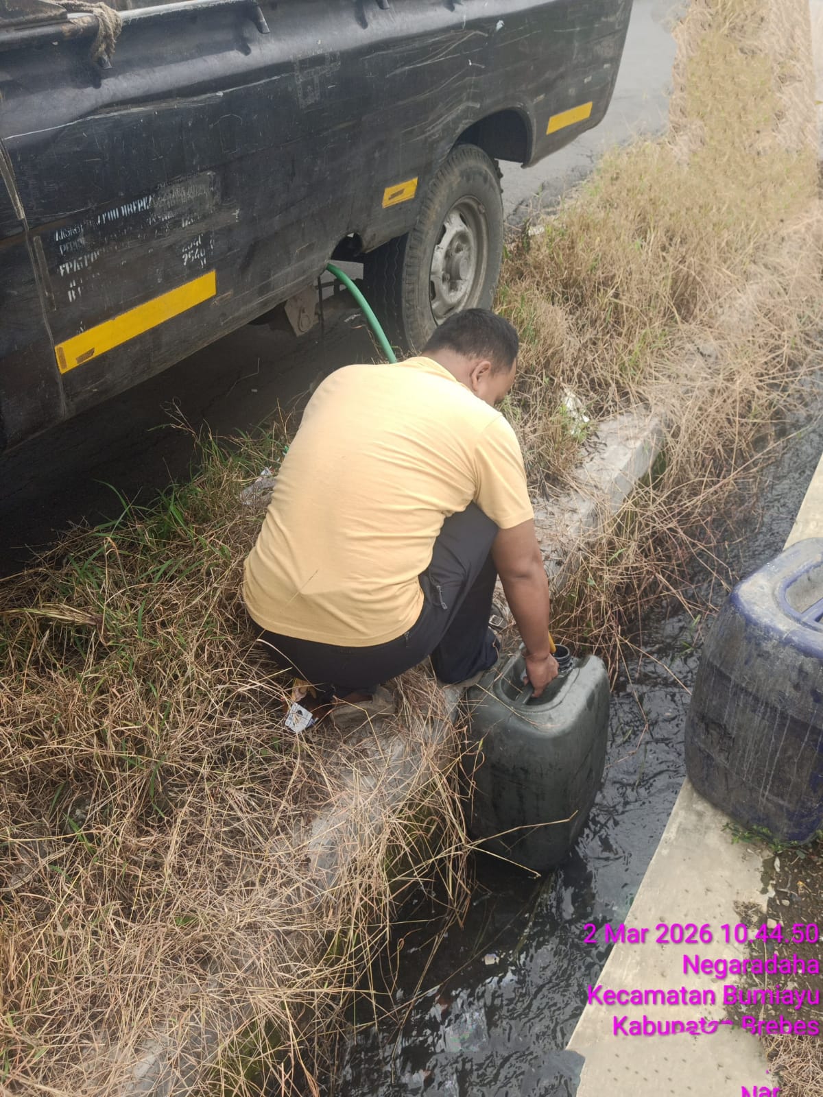 Seorang warga yaitu (AP),Dukuh Al Barokah,Krajan RT 05 RW 04 Desa Kretek,Paguyangan,Brebes,Jawa Tengah. Dengan sengaja menyedot BBM Bahan Bakar Minyak bersubsidi yaitu Solar dari tanki mobil pick up L300 (Cyclone) dengan Nomor Polisi G 8826 UG dipinggir jalan raya Desa Negaradaha Senin 02/03/2026