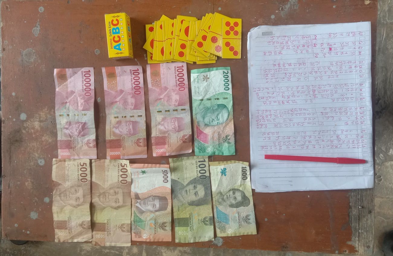 Barang bukti yang berhasil diamankan antara lain Uang tunai sebesar Rp. 337.000,-, Satu buku tulis berisi rekapan, Satu bolpoin merah, Satu set kartu domino.