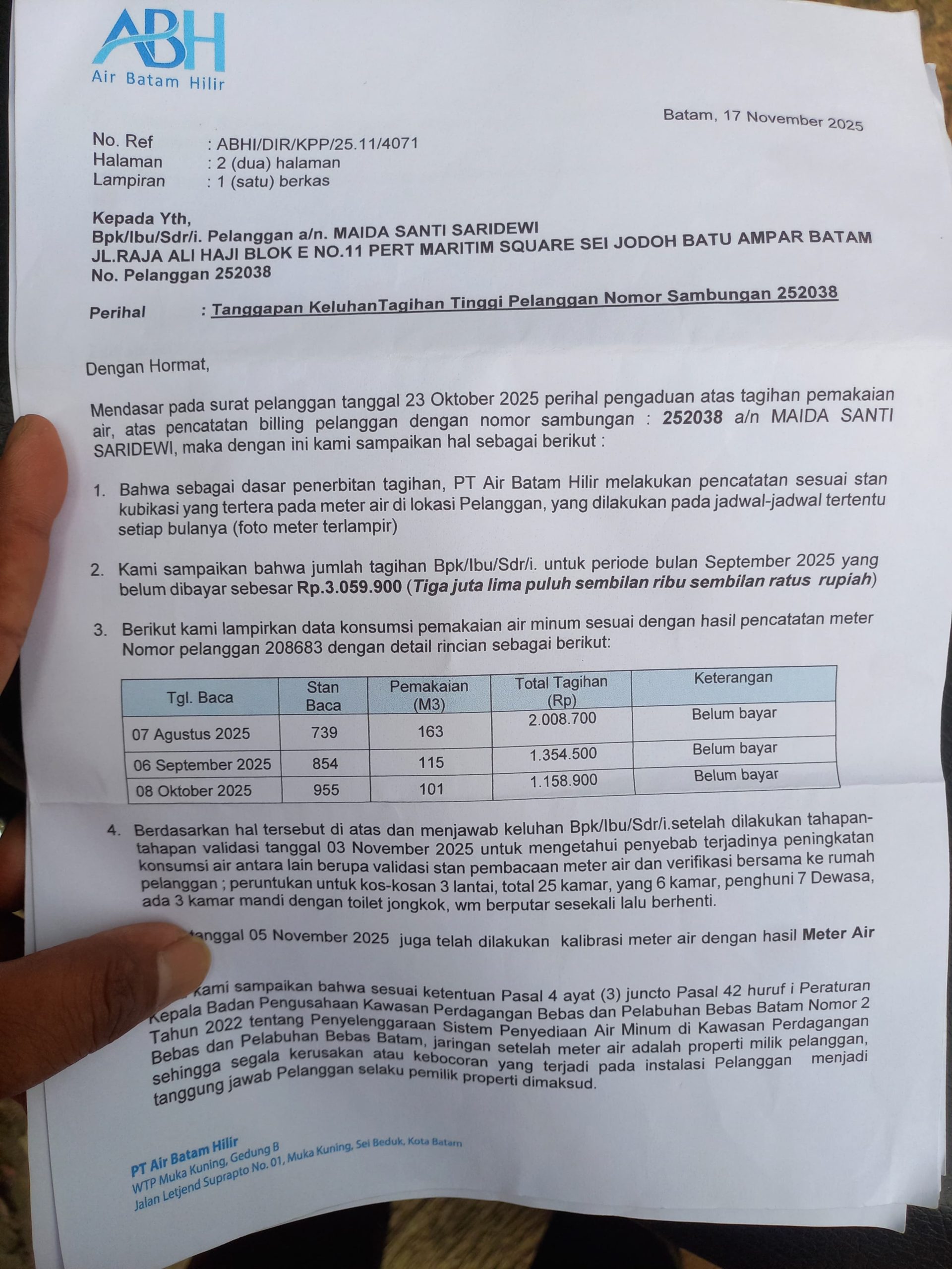 Warga Batam Dirugikan Tagihan Air Tak Wajar, Meteran Dicabut Sepihak Oleh ABH / Air Batam Hilir